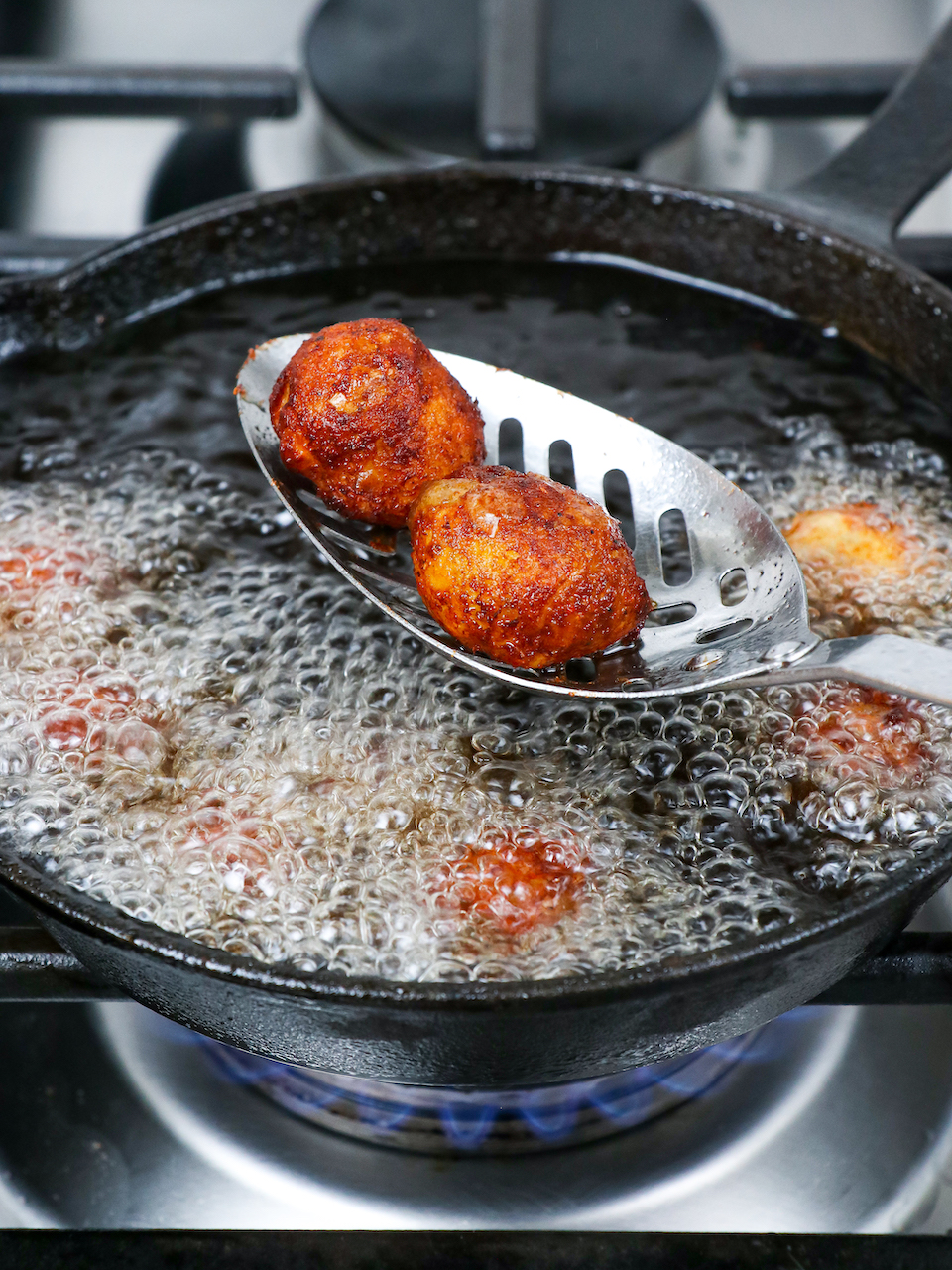 - Use a slotted spoon to remove the potato balls from the hot oil.